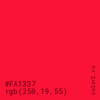 Цвет #FA1337 в цветовой модели RGB обозначается тремя октетами (250, 19, 55) в десятичном формате и #FA1337 в шестнадцатиричном (hex) формате, которые являются интенсивностью красного 250 (hex FA), интенсивность зелёного 19 (hex 13) и интенсивность синего 55 (hex 37).