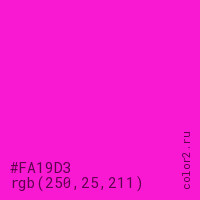 Цвет #FA19D3 в цветовой модели RGB обозначается тремя октетами (250, 25, 211) в десятичном формате и #FA19D3 в шестнадцатиричном (hex) формате, которые являются интенсивностью красного 250 (hex FA), интенсивность зелёного 25 (hex 19) и интенсивность синего 211 (hex D3).