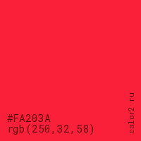 Цвет #FA203A в цветовой модели RGB обозначается тремя октетами (250, 32, 58) в десятичном формате и #FA203A в шестнадцатиричном (hex) формате, которые являются интенсивностью красного 250 (hex FA), интенсивность зелёного 32 (hex 20) и интенсивность синего 58 (hex 3A).