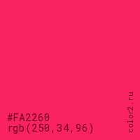 Цвет #FA2260 в цветовой модели RGB обозначается тремя октетами (250, 34, 96) в десятичном формате и #FA2260 в шестнадцатиричном (hex) формате, которые являются интенсивностью красного 250 (hex FA), интенсивность зелёного 34 (hex 22) и интенсивность синего 96 (hex 60).