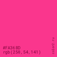 Цвет #FA368D в цветовой модели RGB обозначается тремя октетами (250, 54, 141) в десятичном формате и #FA368D в шестнадцатиричном (hex) формате, которые являются интенсивностью красного 250 (hex FA), интенсивность зелёного 54 (hex 36) и интенсивность синего 141 (hex 8D).
