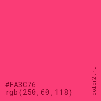 Цвет #FA3C76 в цветовой модели RGB обозначается тремя октетами (250, 60, 118) в десятичном формате и #FA3C76 в шестнадцатиричном (hex) формате, которые являются интенсивностью красного 250 (hex FA), интенсивность зелёного 60 (hex 3C) и интенсивность синего 118 (hex 76).