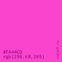 Цвет #FA44CD в цветовой модели RGB обозначается тремя октетами (250, 68, 205) в десятичном формате и #FA44CD в шестнадцатиричном (hex) формате, которые являются интенсивностью красного 250 (hex FA), интенсивность зелёного 68 (hex 44) и интенсивность синего 205 (hex CD).