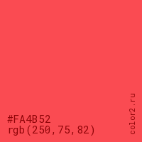 Цвет #FA4B52 в цветовой модели RGB обозначается тремя октетами (250, 75, 82) в десятичном формате и #FA4B52 в шестнадцатиричном (hex) формате, которые являются интенсивностью красного 250 (hex FA), интенсивность зелёного 75 (hex 4B) и интенсивность синего 82 (hex 52).