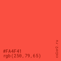 Цвет #FA4F41 в цветовой модели RGB обозначается тремя октетами (250, 79, 65) в десятичном формате и #FA4F41 в шестнадцатиричном (hex) формате, которые являются интенсивностью красного 250 (hex FA), интенсивность зелёного 79 (hex 4F) и интенсивность синего 65 (hex 41).