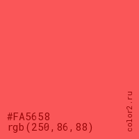 Цвет #FA5658 в цветовой модели RGB обозначается тремя октетами (250, 86, 88) в десятичном формате и #FA5658 в шестнадцатиричном (hex) формате, которые являются интенсивностью красного 250 (hex FA), интенсивность зелёного 86 (hex 56) и интенсивность синего 88 (hex 58).