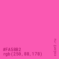 Цвет #FA58B2 в цветовой модели RGB обозначается тремя октетами (250, 88, 178) в десятичном формате и #FA58B2 в шестнадцатиричном (hex) формате, которые являются интенсивностью красного 250 (hex FA), интенсивность зелёного 88 (hex 58) и интенсивность синего 178 (hex B2).