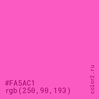 Цвет #FA5AC1 в цветовой модели RGB обозначается тремя октетами (250, 90, 193) в десятичном формате и #FA5AC1 в шестнадцатиричном (hex) формате, которые являются интенсивностью красного 250 (hex FA), интенсивность зелёного 90 (hex 5A) и интенсивность синего 193 (hex C1).