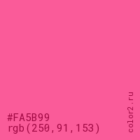 Цвет #FA5B99 в цветовой модели RGB обозначается тремя октетами (250, 91, 153) в десятичном формате и #FA5B99 в шестнадцатиричном (hex) формате, которые являются интенсивностью красного 250 (hex FA), интенсивность зелёного 91 (hex 5B) и интенсивность синего 153 (hex 99).