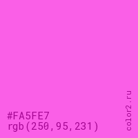 Цвет #FA5FE7 в цветовой модели RGB обозначается тремя октетами (250, 95, 231) в десятичном формате и #FA5FE7 в шестнадцатиричном (hex) формате, которые являются интенсивностью красного 250 (hex FA), интенсивность зелёного 95 (hex 5F) и интенсивность синего 231 (hex E7).