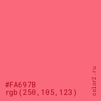 Цвет #FA697B в цветовой модели RGB обозначается тремя октетами (250, 105, 123) в десятичном формате и #FA697B в шестнадцатиричном (hex) формате, которые являются интенсивностью красного 250 (hex FA), интенсивность зелёного 105 (hex 69) и интенсивность синего 123 (hex 7B).