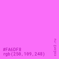Цвет #FA6DF8 в цветовой модели RGB обозначается тремя октетами (250, 109, 248) в десятичном формате и #FA6DF8 в шестнадцатиричном (hex) формате, которые являются интенсивностью красного 250 (hex FA), интенсивность зелёного 109 (hex 6D) и интенсивность синего 248 (hex F8).