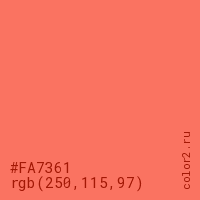 Цвет #FA7361 в цветовой модели RGB обозначается тремя октетами (250, 115, 97) в десятичном формате и #FA7361 в шестнадцатиричном (hex) формате, которые являются интенсивностью красного 250 (hex FA), интенсивность зелёного 115 (hex 73) и интенсивность синего 97 (hex 61).