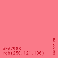 Цвет #FA7988 в цветовой модели RGB обозначается тремя октетами (250, 121, 136) в десятичном формате и #FA7988 в шестнадцатиричном (hex) формате, которые являются интенсивностью красного 250 (hex FA), интенсивность зелёного 121 (hex 79) и интенсивность синего 136 (hex 88).