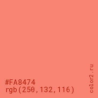 Цвет #FA8474 в цветовой модели RGB обозначается тремя октетами (250, 132, 116) в десятичном формате и #FA8474 в шестнадцатиричном (hex) формате, которые являются интенсивностью красного 250 (hex FA), интенсивность зелёного 132 (hex 84) и интенсивность синего 116 (hex 74).
