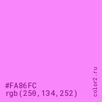 Цвет #FA86FC в цветовой модели RGB обозначается тремя октетами (250, 134, 252) в десятичном формате и #FA86FC в шестнадцатиричном (hex) формате, которые являются интенсивностью красного 250 (hex FA), интенсивность зелёного 134 (hex 86) и интенсивность синего 252 (hex FC).