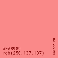 Цвет #FA8989 в цветовой модели RGB обозначается тремя октетами (250, 137, 137) в десятичном формате и #FA8989 в шестнадцатиричном (hex) формате, которые являются интенсивностью красного 250 (hex FA), интенсивность зелёного 137 (hex 89) и интенсивность синего 137 (hex 89).
