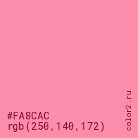 Цвет #FA8CAC в цветовой модели RGB обозначается тремя октетами (250, 140, 172) в десятичном формате и #FA8CAC в шестнадцатиричном (hex) формате, которые являются интенсивностью красного 250 (hex FA), интенсивность зелёного 140 (hex 8C) и интенсивность синего 172 (hex AC).