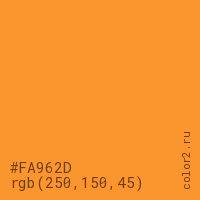 Цвет #FA962D в цветовой модели RGB обозначается тремя октетами (250, 150, 45) в десятичном формате и #FA962D в шестнадцатиричном (hex) формате, которые являются интенсивностью красного 250 (hex FA), интенсивность зелёного 150 (hex 96) и интенсивность синего 45 (hex 2D).