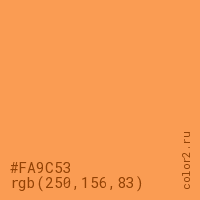 Цвет #FA9C53 в цветовой модели RGB обозначается тремя октетами (250, 156, 83) в десятичном формате и #FA9C53 в шестнадцатиричном (hex) формате, которые являются интенсивностью красного 250 (hex FA), интенсивность зелёного 156 (hex 9C) и интенсивность синего 83 (hex 53).