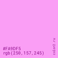 Цвет #FA9DF5 в цветовой модели RGB обозначается тремя октетами (250, 157, 245) в десятичном формате и #FA9DF5 в шестнадцатиричном (hex) формате, которые являются интенсивностью красного 250 (hex FA), интенсивность зелёного 157 (hex 9D) и интенсивность синего 245 (hex F5).