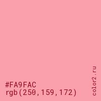 Цвет #FA9FAC в цветовой модели RGB обозначается тремя октетами (250, 159, 172) в десятичном формате и #FA9FAC в шестнадцатиричном (hex) формате, которые являются интенсивностью красного 250 (hex FA), интенсивность зелёного 159 (hex 9F) и интенсивность синего 172 (hex AC).