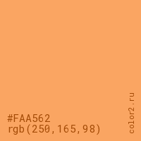 Цвет #FAA562 в цветовой модели RGB обозначается тремя октетами (250, 165, 98) в десятичном формате и #FAA562 в шестнадцатиричном (hex) формате, которые являются интенсивностью красного 250 (hex FA), интенсивность зелёного 165 (hex A5) и интенсивность синего 98 (hex 62).