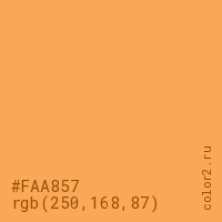 Цвет #FAA857 в цветовой модели RGB обозначается тремя октетами (250, 168, 87) в десятичном формате и #FAA857 в шестнадцатиричном (hex) формате, которые являются интенсивностью красного 250 (hex FA), интенсивность зелёного 168 (hex A8) и интенсивность синего 87 (hex 57).