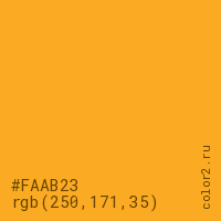 Цвет #FAAB23 в цветовой модели RGB обозначается тремя октетами (250, 171, 35) в десятичном формате и #FAAB23 в шестнадцатиричном (hex) формате, которые являются интенсивностью красного 250 (hex FA), интенсивность зелёного 171 (hex AB) и интенсивность синего 35 (hex 23).
