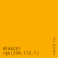Цвет #FAAC01 в цветовой модели RGB обозначается тремя октетами (250, 172, 1) в десятичном формате и #FAAC01 в шестнадцатиричном (hex) формате, которые являются интенсивностью красного 250 (hex FA), интенсивность зелёного 172 (hex AC) и интенсивность синего 1 (hex 01).