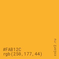 Цвет #FAB12C в цветовой модели RGB обозначается тремя октетами (250, 177, 44) в десятичном формате и #FAB12C в шестнадцатиричном (hex) формате, которые являются интенсивностью красного 250 (hex FA), интенсивность зелёного 177 (hex B1) и интенсивность синего 44 (hex 2C).