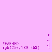 Цвет #FAB4FD в цветовой модели RGB обозначается тремя октетами (250, 180, 253) в десятичном формате и #FAB4FD в шестнадцатиричном (hex) формате, которые являются интенсивностью красного 250 (hex FA), интенсивность зелёного 180 (hex B4) и интенсивность синего 253 (hex FD).