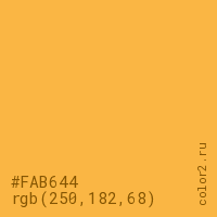 Цвет #FAB644 в цветовой модели RGB обозначается тремя октетами (250, 182, 68) в десятичном формате и #FAB644 в шестнадцатиричном (hex) формате, которые являются интенсивностью красного 250 (hex FA), интенсивность зелёного 182 (hex B6) и интенсивность синего 68 (hex 44).
