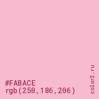 Цвет #FABACE в цветовой модели RGB обозначается тремя октетами (250, 186, 206) в десятичном формате и #FABACE в шестнадцатиричном (hex) формате, которые являются интенсивностью красного 250 (hex FA), интенсивность зелёного 186 (hex BA) и интенсивность синего 206 (hex CE).