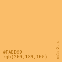 Цвет #FABD69 в цветовой модели RGB обозначается тремя октетами (250, 189, 105) в десятичном формате и #FABD69 в шестнадцатиричном (hex) формате, которые являются интенсивностью красного 250 (hex FA), интенсивность зелёного 189 (hex BD) и интенсивность синего 105 (hex 69).