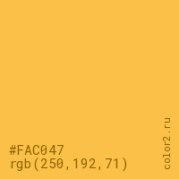 Цвет #FAC047 в цветовой модели RGB обозначается тремя октетами (250, 192, 71) в десятичном формате и #FAC047 в шестнадцатиричном (hex) формате, которые являются интенсивностью красного 250 (hex FA), интенсивность зелёного 192 (hex C0) и интенсивность синего 71 (hex 47).
