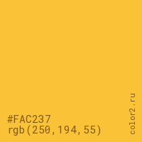 Цвет #FAC237 в цветовой модели RGB обозначается тремя октетами (250, 194, 55) в десятичном формате и #FAC237 в шестнадцатиричном (hex) формате, которые являются интенсивностью красного 250 (hex FA), интенсивность зелёного 194 (hex C2) и интенсивность синего 55 (hex 37).