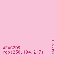 Цвет #FAC2D9 в цветовой модели RGB обозначается тремя октетами (250, 194, 217) в десятичном формате и #FAC2D9 в шестнадцатиричном (hex) формате, которые являются интенсивностью красного 250 (hex FA), интенсивность зелёного 194 (hex C2) и интенсивность синего 217 (hex D9).