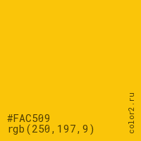 Цвет #FAC509 в цветовой модели RGB обозначается тремя октетами (250, 197, 9) в десятичном формате и #FAC509 в шестнадцатиричном (hex) формате, которые являются интенсивностью красного 250 (hex FA), интенсивность зелёного 197 (hex C5) и интенсивность синего 9 (hex 09).