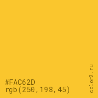 Цвет #FAC62D в цветовой модели RGB обозначается тремя октетами (250, 198, 45) в десятичном формате и #FAC62D в шестнадцатиричном (hex) формате, которые являются интенсивностью красного 250 (hex FA), интенсивность зелёного 198 (hex C6) и интенсивность синего 45 (hex 2D).