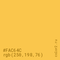 Цвет #FAC64C в цветовой модели RGB обозначается тремя октетами (250, 198, 76) в десятичном формате и #FAC64C в шестнадцатиричном (hex) формате, которые являются интенсивностью красного 250 (hex FA), интенсивность зелёного 198 (hex C6) и интенсивность синего 76 (hex 4C).