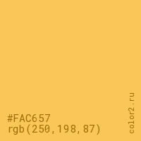 Цвет #FAC657 в цветовой модели RGB обозначается тремя октетами (250, 198, 87) в десятичном формате и #FAC657 в шестнадцатиричном (hex) формате, которые являются интенсивностью красного 250 (hex FA), интенсивность зелёного 198 (hex C6) и интенсивность синего 87 (hex 57).