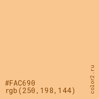 Цвет #FAC690 в цветовой модели RGB обозначается тремя октетами (250, 198, 144) в десятичном формате и #FAC690 в шестнадцатиричном (hex) формате, которые являются интенсивностью красного 250 (hex FA), интенсивность зелёного 198 (hex C6) и интенсивность синего 144 (hex 90).