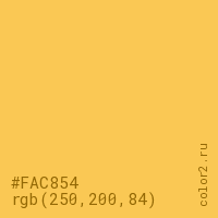 Цвет #FAC854 в цветовой модели RGB обозначается тремя октетами (250, 200, 84) в десятичном формате и #FAC854 в шестнадцатиричном (hex) формате, которые являются интенсивностью красного 250 (hex FA), интенсивность зелёного 200 (hex C8) и интенсивность синего 84 (hex 54).