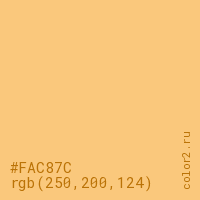 Цвет #FAC87C в цветовой модели RGB обозначается тремя октетами (250, 200, 124) в десятичном формате и #FAC87C в шестнадцатиричном (hex) формате, которые являются интенсивностью красного 250 (hex FA), интенсивность зелёного 200 (hex C8) и интенсивность синего 124 (hex 7C).