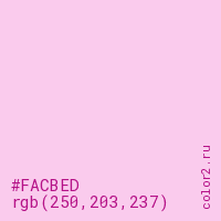 Цвет #FACBED в цветовой модели RGB обозначается тремя октетами (250, 203, 237) в десятичном формате и #FACBED в шестнадцатиричном (hex) формате, которые являются интенсивностью красного 250 (hex FA), интенсивность зелёного 203 (hex CB) и интенсивность синего 237 (hex ED).