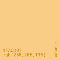 Цвет #FACD87 в цветовой модели RGB обозначается тремя октетами (250, 205, 135) в десятичном формате и #FACD87 в шестнадцатиричном (hex) формате, которые являются интенсивностью красного 250 (hex FA), интенсивность зелёного 205 (hex CD) и интенсивность синего 135 (hex 87).
