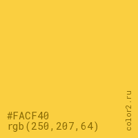 Цвет #FACF40 в цветовой модели RGB обозначается тремя октетами (250, 207, 64) в десятичном формате и #FACF40 в шестнадцатиричном (hex) формате, которые являются интенсивностью красного 250 (hex FA), интенсивность зелёного 207 (hex CF) и интенсивность синего 64 (hex 40).