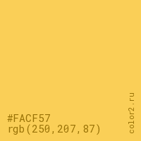 Цвет #FACF57 в цветовой модели RGB обозначается тремя октетами (250, 207, 87) в десятичном формате и #FACF57 в шестнадцатиричном (hex) формате, которые являются интенсивностью красного 250 (hex FA), интенсивность зелёного 207 (hex CF) и интенсивность синего 87 (hex 57).