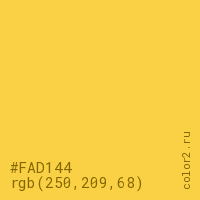 Цвет #FAD144 в цветовой модели RGB обозначается тремя октетами (250, 209, 68) в десятичном формате и #FAD144 в шестнадцатиричном (hex) формате, которые являются интенсивностью красного 250 (hex FA), интенсивность зелёного 209 (hex D1) и интенсивность синего 68 (hex 44).